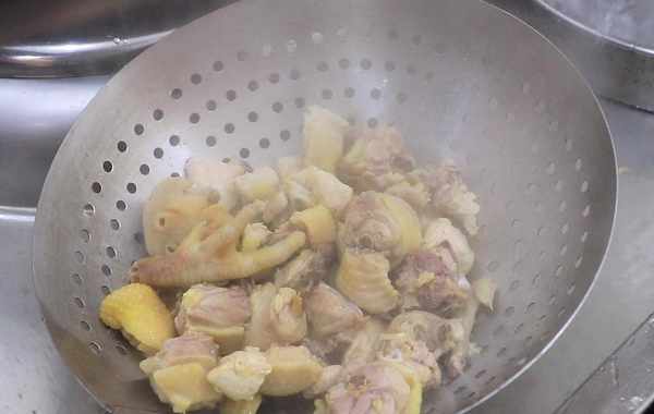 3.鍋內再燒水,冷水放入雞塊,淋入一點料酒去腥,煮出雞塊中的血水,水燒開以後打入鍋中的浮沫,大約煮2分鐘,把雞塊倒出來,用清水沖掉上面的血沫。