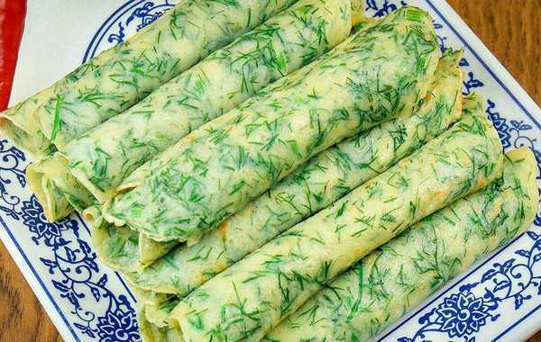 4.電餅鐺預熱3分鐘,均勻淋上植物油,往鍋中挖入適量的面糊,攤成圓形的薄餅,厚度要均勻一些更容易烙熟,蓋上鍋蓋烙1分鐘,餅邊緣微微變色時翻面,翻過來之後再烙10秒鐘即可出鍋。把烙好的小餅卷起來擺放在盤中,配上蒜蓉醬就能食用瞭。