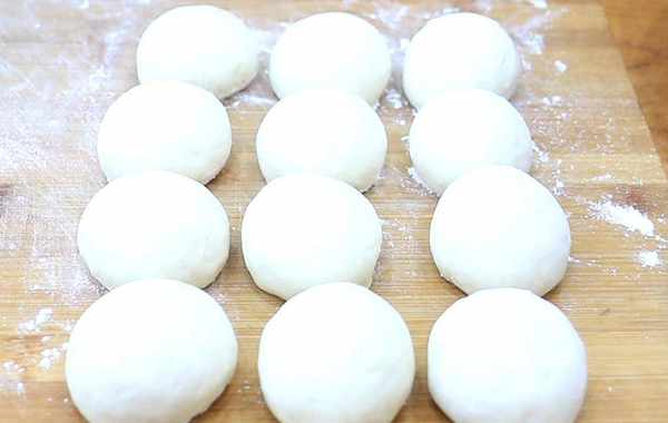 4.面團發酵好以後在案板上撒上底面粉,取出面團搓揉排氣,搓成長條再切成大小相同的面劑,每一個面劑都搓揉一下,搓成圓面坯放在一起,放置松弛一下,用白細佈蓋住防止面坯風幹表皮起皺。