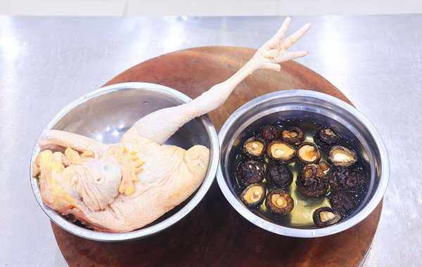 1.準備一把幹香菇,放入清水中泡發,泡軟以後把根去除,生薑切成片,大蔥切成馬蹄片,香菜洗幹凈切成段。麻公雞半隻,去除雞屁股和雞腳趾,把雞肉剁成均勻的小塊。