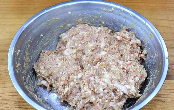 2.五花肉一塊,剁好的肉餡放入盆中,加入適量的食鹽、雞粉、老抽、生抽,倒入剛才打好的蔥薑水,順著一個方向攪拌摔打,再加入蔥薑水,攪拌出豬肉的膠質;再次加入蔥薑水,攪拌至肉餡粘稠即可。
