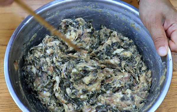 3.馬齒莧也已經泡好瞭,把它擠幹水分切成小段,不要太碎,大概1厘米左右就可以瞭,和肉餡攪拌在一起,此時的肉餡非常的勁道,攪拌的時候要多用點力氣。