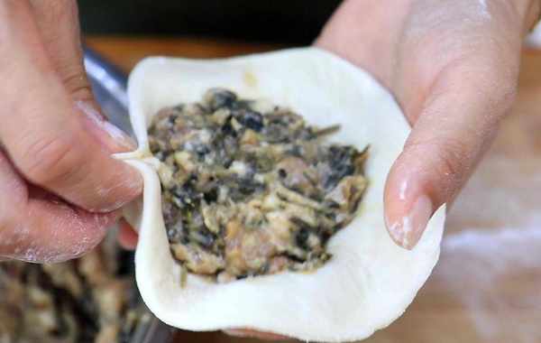 5.取出一個面劑,用小搟面杖搟開,搟成圓面皮,搟的時候最好是搟成中間厚四周薄一點,這樣包出來的包子才會皮薄餡多好吃,把面劑子一個一個全部搟好以後,取出面皮用左手托著放入調好的肉餡,右手的拇指和食指往一起捏,照著這個方法把包子全部包好。