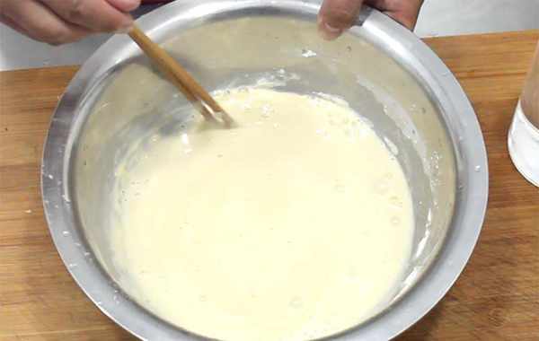 2.準備面粉60克,加入食鹽2克,雞粉2克,十三香1克,打入2個雞蛋,雞蛋能使做出的餅口感更軟嫩,營養豐富,這時我們少加一點水,把面粉攪成面糊,攪拌至沒有面疙瘩,再次加入70克涼開水攪拌均勻。