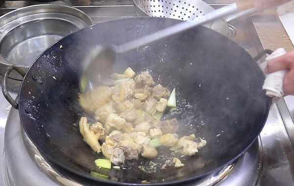 4.鍋內燒油,充分滑鍋以後倒出熱油加入涼油,這一步能防止雞塊粘鍋,把雞塊倒入鍋中,開中火煸炒2分鐘,炒出裡面的水分。