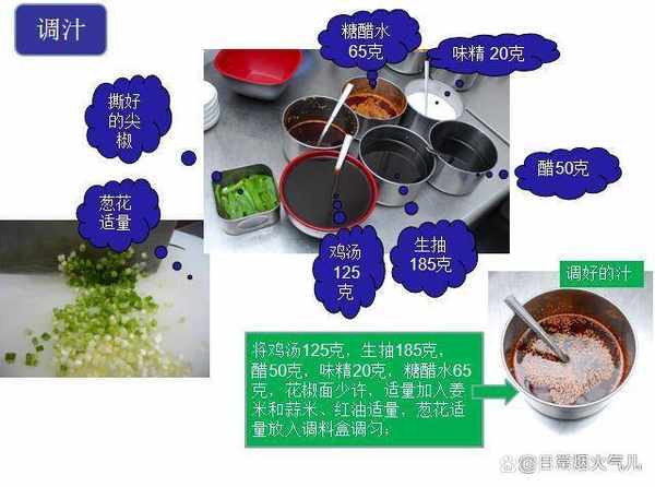 醋50克,味精20克,糖醋水65克,花椒面少許,適量加入薑米和蒜米、紅油適量,蔥花適量放入調料盒調勻。
