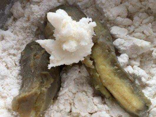 第四步,倒入滾燙的開水,燙成棉絮,加上一小塊豬油和一塊蒸熟的紅薯,和成軟硬適中的面團,靜置5分鐘;