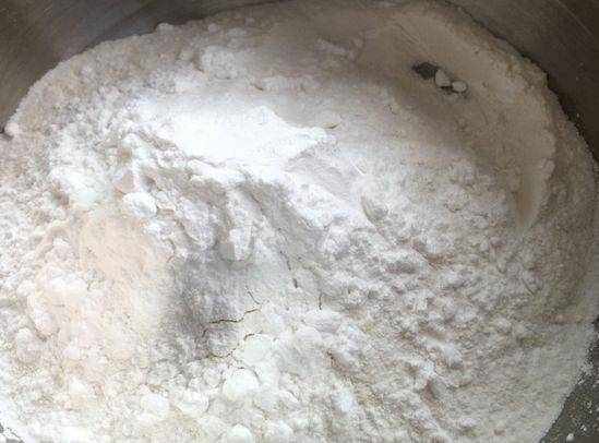 第三步,糯米粉、大米粉和澄面稱好重量後,盛在一個盆中,攪拌均勻;