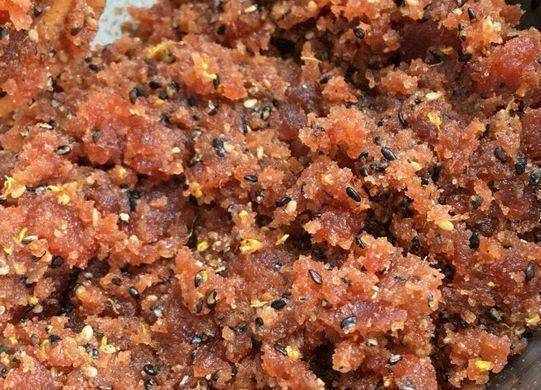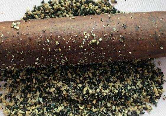 制作過程:第一步,首先制作山楂餡兒,將黑、白芝麻烤熟,用搟面杖壓碎;