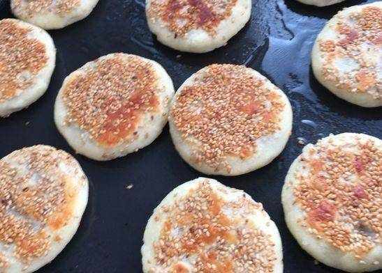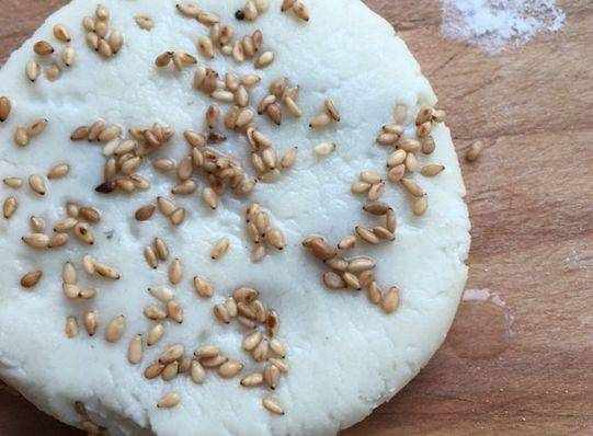 第五步,靜置好之後,將面團分成是30克左右的劑子,包上適量的山楂餡兒,收口朝下按扁後,塗上點水,蘸上白芝麻;