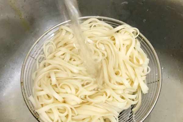 步驟3面條煮好後沖冷水。