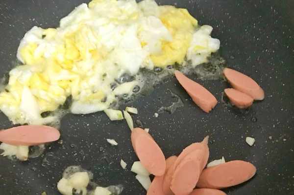 步驟5雞蛋煎好之後,把蒜蓉和火腿腸炒香。