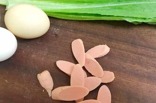 步驟1火腿腸切片,雞蛋我喜歡直接煎的,也可以打散備用。