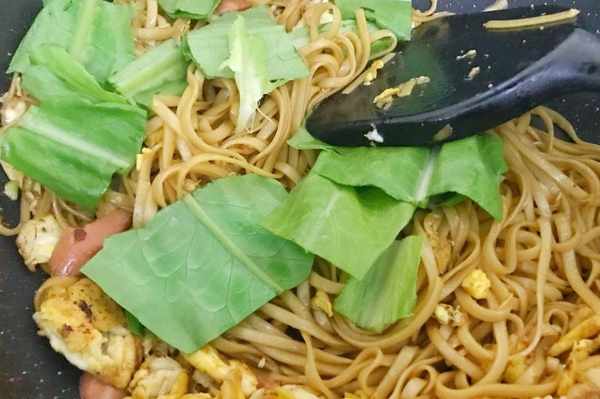 步驟7把面條炒均勻,放入青菜炒熟。
