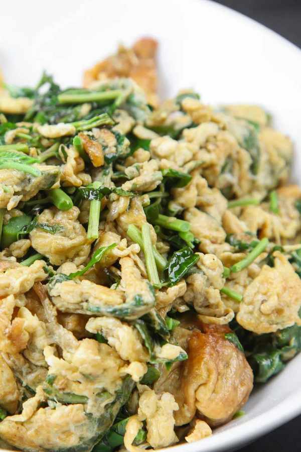 如果對香椿略加粗爆的烹調方式,即可與雞蛋燴炒。這也是香椿的最傢常的烹調方式。椿色翠綠,蛋塊金黃,這道菜從色澤上看,可以再起一個名字——《新龍門客棧》裡的“金鑲玉”。