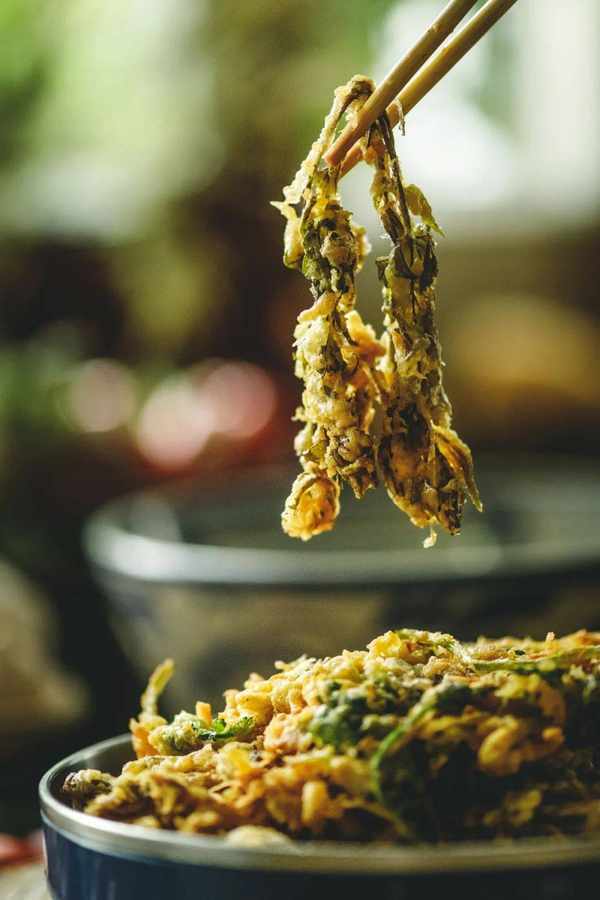 而對香椿芽更粗暴的烹調,則是按天婦羅的方式處理。將汆過水的椿芽裹上加蛋液調料的薄面漿,再下油鍋烈火烹油的烹炸,這也是老北京所稱道的“香椿魚兒”。上過漿,又下過油鍋的椿芽兒口感上外酥裡嫩,試嘗之下,則是一口脆鮮,滿腹椿香。