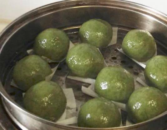 步驟七:然後把青團擺入蒸籠內,拿小刷子在每個上面刷一點點食用油,冷水上鍋,大火燒開,繼續蒸15-20分鐘,即可取出食用。