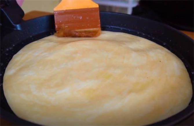 12.電餅鐺大火把鍋預熱好之後,咱們裡面刷層油,放餅皮,用手轉一下使其受熱均勻,然後蓋上蓋子上下火一起烙,大概烙瞭一分鐘,看到電餅鐺冒熱氣瞭,這時候咱們在表面刷點油,翻一個面繼續烙。
