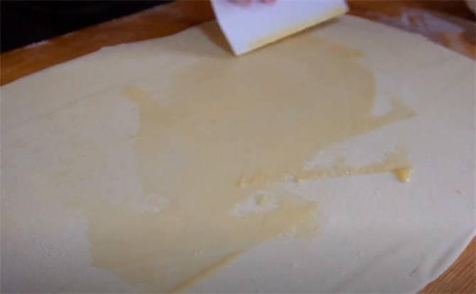 4.案板上撒些幹面粉,把小面劑按扁,然後搟開,這個是提前做好的稀油酥,就是把油燒熱澆在面粉上,加點鹽調味就行瞭,用刮板把這個油酥均勻地抹開。