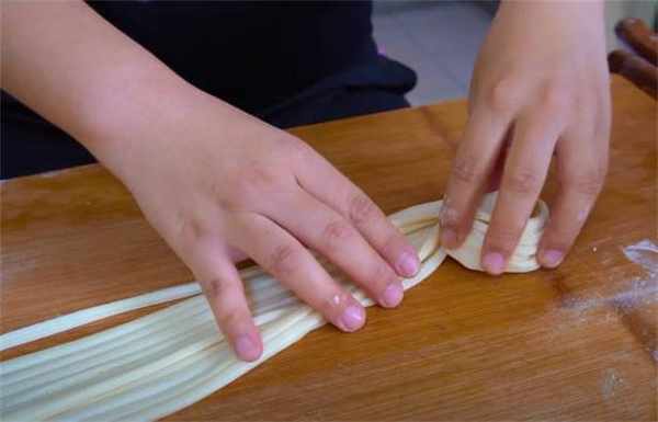8.咱們把這兩端提起來,稍微的給它扯長瞭,就像扯拉面一樣,從一端這樣卷起來就行瞭。