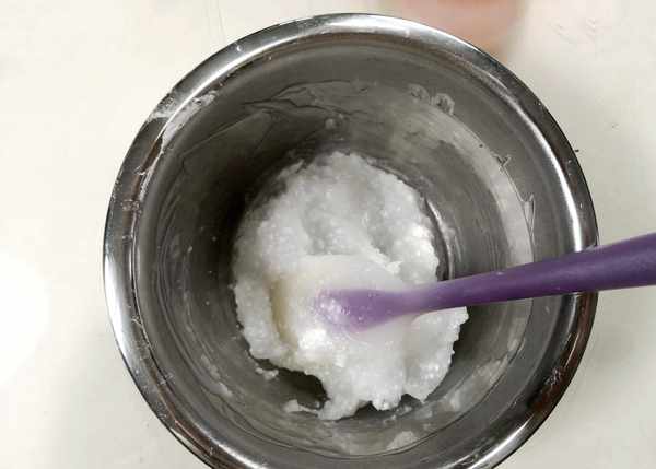 3、步驟2中開水要一次性倒入,這個過程稱之為燙面,是非常重要的一步。如果開水慢慢的加,就容易越攪越稀,導致整個配比失衡,青團制作失敗。