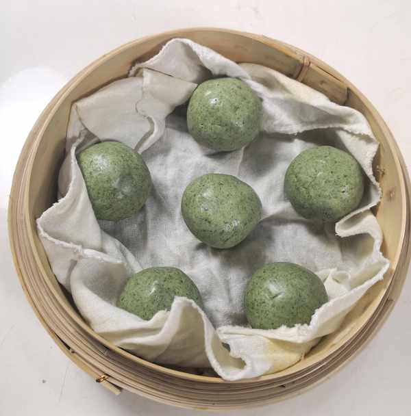 10、蒸鍋大火燒開一鍋水,在青團表面薄薄塗一層融化的豬油,碼好放入墊有蒸籠佈的蒸鍋中,大火蒸15-20分鐘即可。(蒸的時間具體視灶具火力而定。)