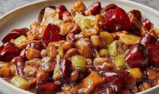 主料雞腿肉150克、淀粉25克、醬油5克、料酒5克、水淀粉10克、醋30克、鹽1克、醬油1克、白胡椒粉1克、白糖20克、大蔥30克、獨蒜5克、老薑3克、幹辣椒15克、花椒1克、花生米35克步驟1.取150克仔公雞雞腿肉,去骨鋪平後用刀後尖剁斷筋膜;2.切條後切1.5厘米見方的雞丁,加5克醬油、5克料酒、25克水淀粉,碼味5分鐘;3.大蔥切1厘米蔥段、薑蒜切片,35克花生炸脆;4.1克鹽、1克白胡椒粉、30克醋、1克醬油、20克白糖和10克水淀粉攪拌平均成碗汁;5.熱鍋下熟菜籽油燒至六成,下幹辣椒段、花椒熗香,撈出;6.繼續加入幹辣椒段、花椒、大蔥蔥白段、蒜片、老薑片熗出味,倒入雞丁疾速翻炒,保持大火炒至斷生,迅速加入味汁炒勻。7.最後加入剩餘的大蔥段和油炸花生米,翻炒平均。小貼士宮保雞丁的標配普通來說隻會加大蔥、薑、蒜和花生米,不會加其他的輔料,由於它會吐水,會影響宮保雞丁的滋味