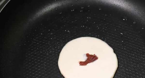 豆沙餡、糯米面糊都準備好以後,還要準備平底鍋,將平底鍋加熱後,把準備好的面糊從高處倒入鍋中,將其倒出餅狀,餅開小火對其進行烙制。等糯米面糊底部定型以後,要用筷子往正中間,放上一些豆沙餡。