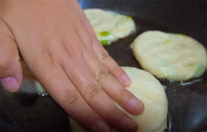 7.咱們把鍋預熱好瞭,多刷點油,把餅胚放下去,放下去之後稍微的按一按。