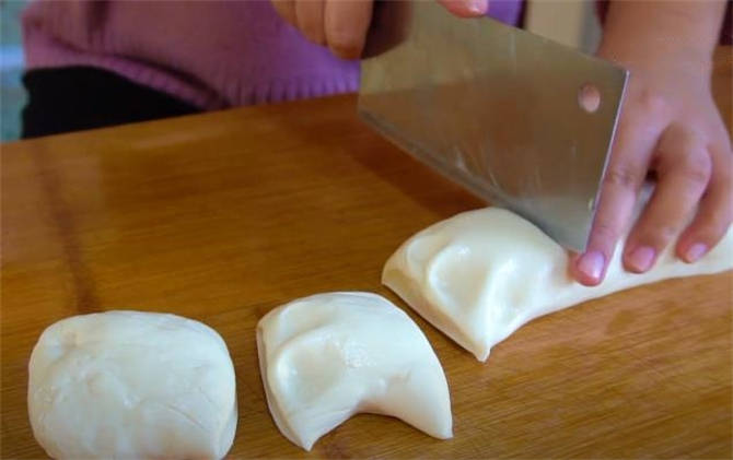 4.案板上抹點油防粘,把面團搓成長條後切成小面劑。