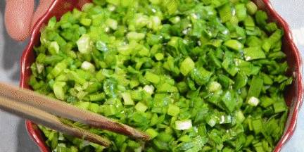 韭菜事先拿清水泡20分鐘,把水瀝凈控幹,然後放入一個秘密武器——白糖,這樣就能保持顏色翠綠不發黑。