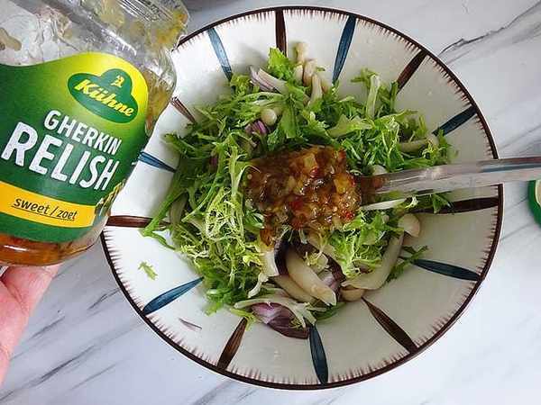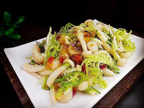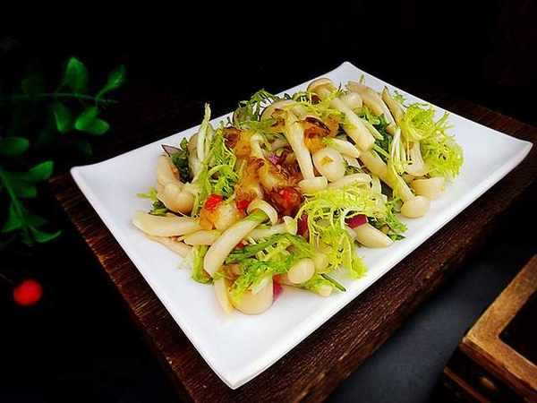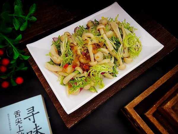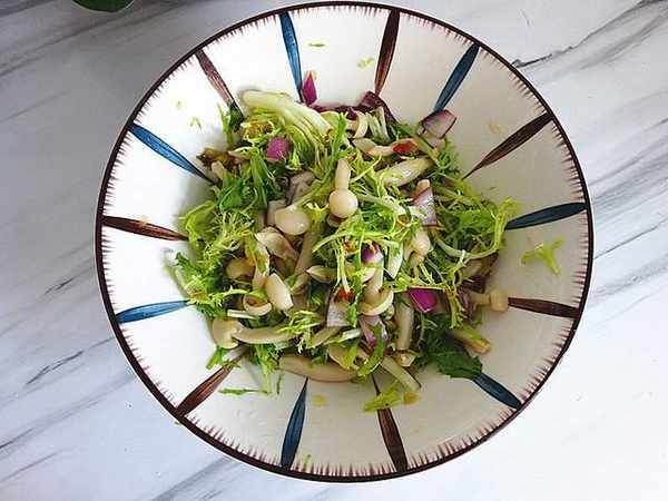 食材:白玉菇200克,苦菊1顆,青瓜沙拉醬2勺,鹽適量。