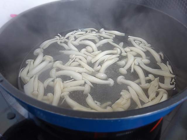 3、燒開水,把白玉菇煮5分鐘左右,就會煮熟、菌菇類的食材就是炒或者做湯等都要先焯水。拌就多煮一會兒至熟。