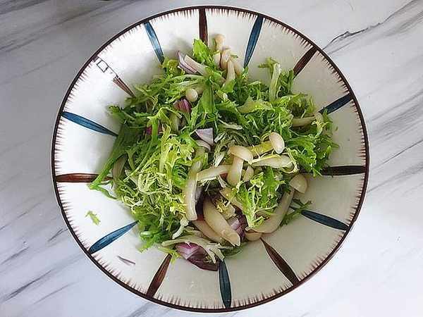 4、煮好的白玉菇撈出晾去熱氣,苦菊直接手撕成段、放入一點洋蔥絲(不愛吃洋蔥的可以不放,或者放蒜),用一點鹽先拌一拌。