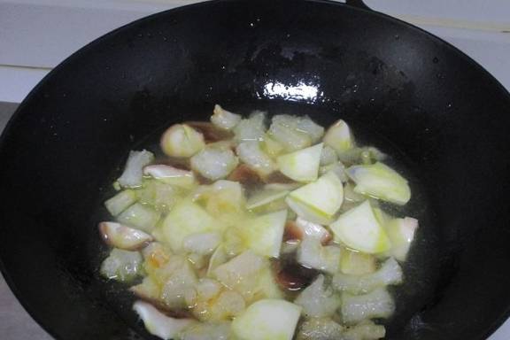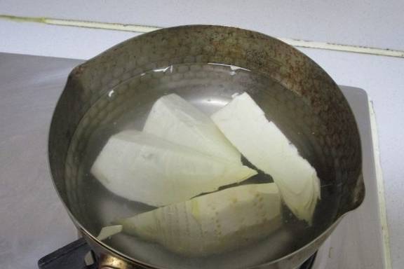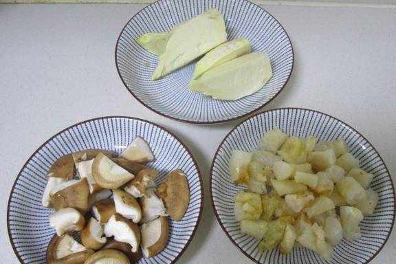 蹄筋要提前泡入清水裡至泡軟後撈起洗凈切段,香菇洗凈切片,冬筍去殼後切4塊