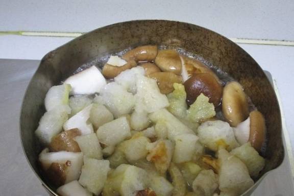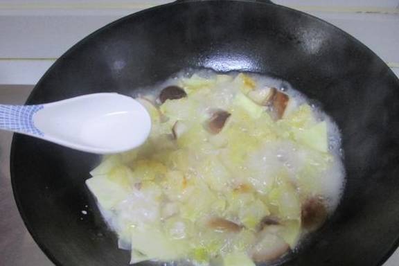 把雞湯倒入鍋中,再加入清水,把蹄筋,筍片和香菇片一起入鍋