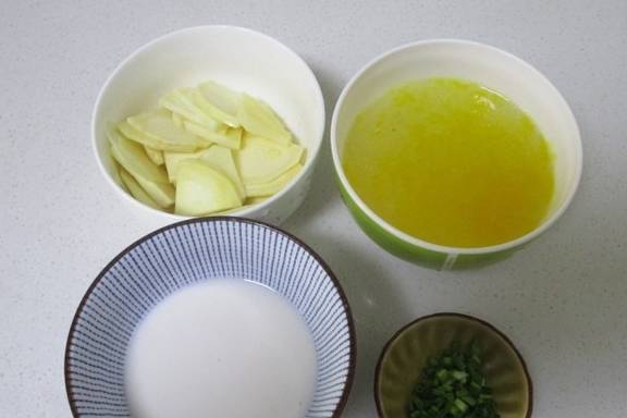 冬筍切片,備好雞湯,水淀粉和蔥花