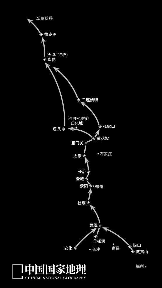 晉商把茶葉貿易越做越大,販運路線由福建、湖南、湖北開始,遠及俄羅斯的莫斯科。圖為明清時期晉商茶葉輸俄路線圖