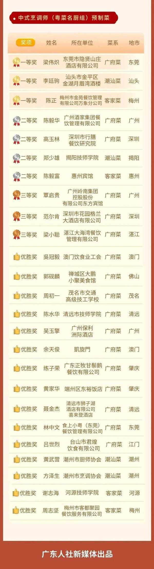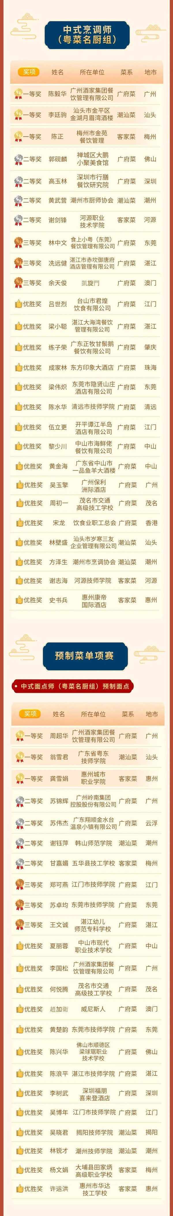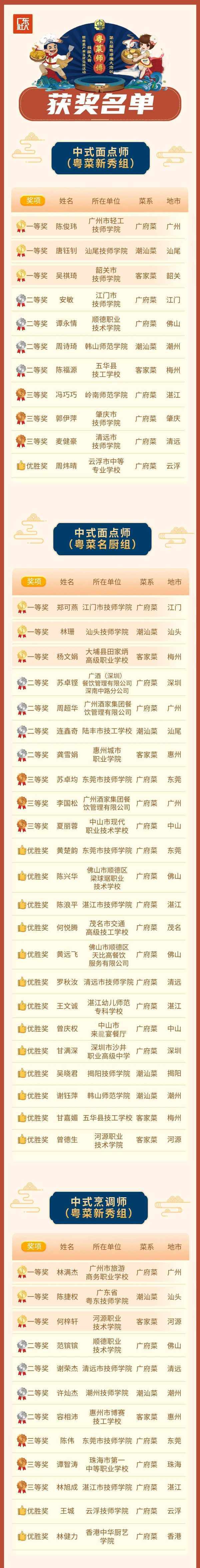 來自粵港澳大灣區和省內外周邊地市25個代表團(隊)、140名參賽選手,經過激烈角逐,產生瞭中式烹調項目一等獎6名、二等獎8名、三等獎6名、優勝獎18名;中式面點項目一等獎6名、二等獎8名、三等獎6名、優勝獎14名;預制菜單項獎項一等獎6名、二等獎8名、三等獎6名、優勝獎28名。