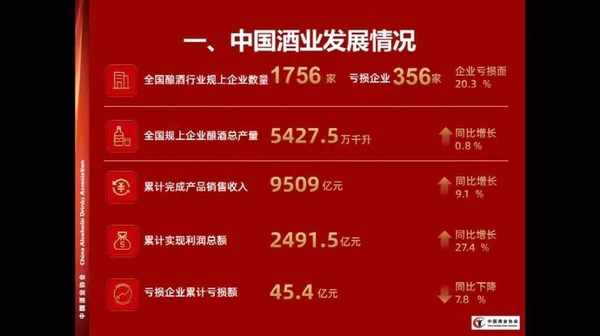 2022年,全國釀酒產業規模以上企業完成釀酒總產量5427.5萬千升,同比增長0.8%;主要經濟效益匯總的規上企業1756傢,其中虧損企業356個,企業虧損面為20.3%;累計完成產品銷售收入9509.0億元,同比增長9.1%;虧損企業累計虧損額45.4億元,同比下降7.8%。
