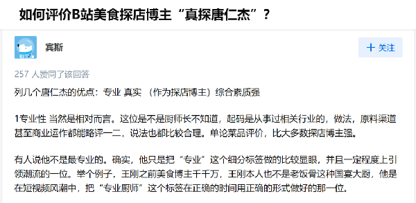 在知乎“如何評價B站美食探店博主‘真探唐仁傑’?”的回答下面,被提到最多的就是“專業”。