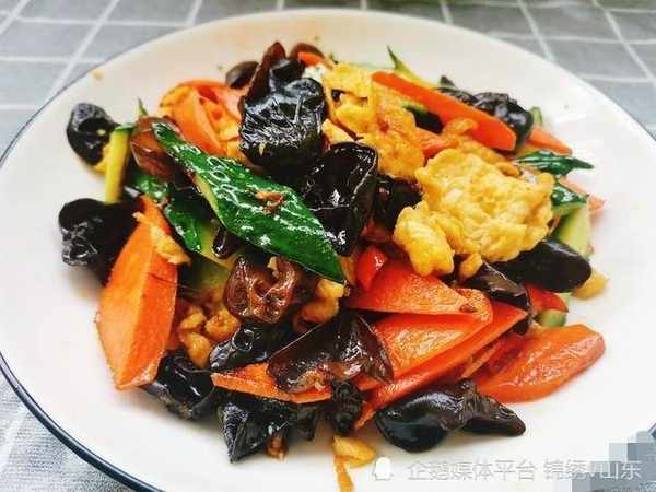 4、然後倒入黑木耳繼續翻炒半分鐘,即可盛出食用。