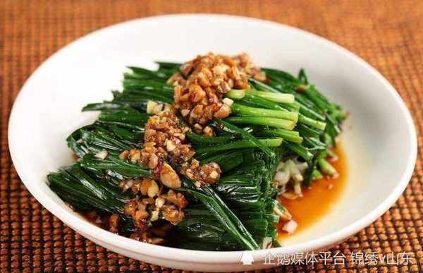 2、韭菜清洗幹凈,控幹水分,改刀切成小段。鍋中加入適量的清水,加入一勺食鹽,幾滴食用油攪拌均勻。水燒開以後,再把韭菜倒入鍋中燙30秒鐘左右。控水撈出放到涼白開水中過涼,這樣可以保持韭菜脆嫩的口感。