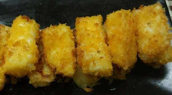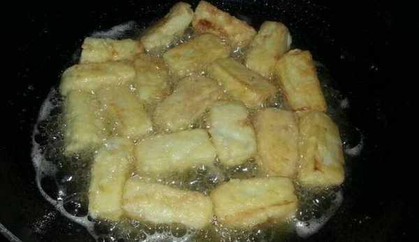 將面粉和玉米淀粉放入碗中調成糊狀,然後加入脫脂牛奶包好。鍋裡放適量的食用油,可以加一點豬油,這樣炒起來會更香。油加熱後,加入塗有面團的牛奶塊,炸至金黃色,然後從鍋中取出。外香裡嫩,非常好吃。