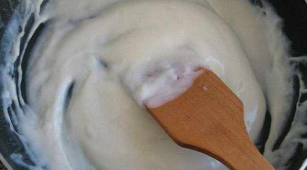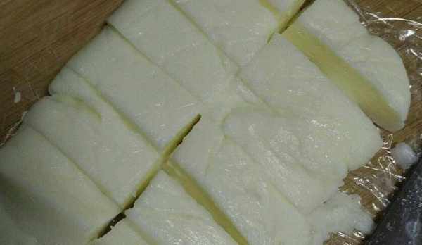 然後準備一個保鮮盒,將煮好的奶糊倒入保鮮盒中,蓋上蓋子放入冰箱冷藏一會,牛奶就會像豆腐一樣凝固,下一步就是將牛奶放入保鮮盒中保鮮盒倒出來,然後切成小塊。切割時要小心,否則很容易切割和腐爛。切成小塊後,牛奶開始煮。