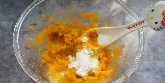 第二步:然後壓成南瓜泥,加入150g左右的糯米粉,揉成沒有幹粉的軟硬適中面團。加入的糯米粉量不一定,要根據面團的狀況做調整。如果太幹,容易裂開,可以分次少量加點清水;如果太濕瞭,就容易粘手,增加糯米粉再和面就好瞭。