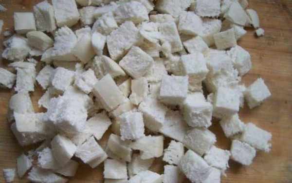 第一步:將第一天的饅頭冷藏一夜,第二天取出,去掉外皮,用刀形將饅頭切成約兩厘米見方的小方塊。.