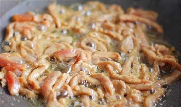4.炒鍋燒熱後,加入一勺油,燒熱後,放入切好的豬肉