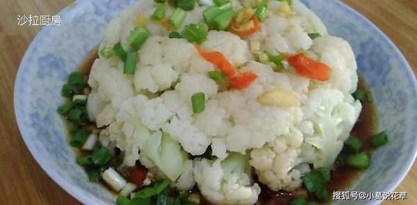 4、把醬汁淋在蔬菜上,撒上蔥花,新鮮簡單美味的花菜就做好瞭。