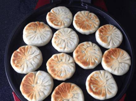 4、包成包子狀,包緊口,翻面稍微壓扁成餅狀,準備好所有的餅坯備用。電烤箱內倒入適量的植物油抹平,然後將蛋糕底一個一個放入,打開底盤電源,蓋上頂蓋開始煎制。大約2到3分鐘後,您可以翻轉並再次煎炸。煎至兩面金黃,然後從鍋中取出。趁熱吃,吃起來特別脆。也可以根據自己的喜好加一些醬料。